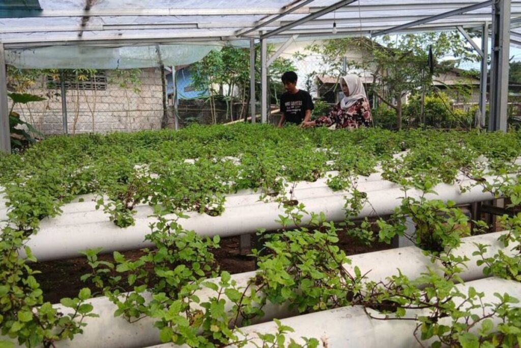 Tujuh bedeng hidroponik bergemericik air nutrisi, menopang pertumbuhan daun mint yang rimbun, hijau, dan harum. Komoditas ini kini banyak dicari oleh kafe dan hotel di Pangkalpinang.
